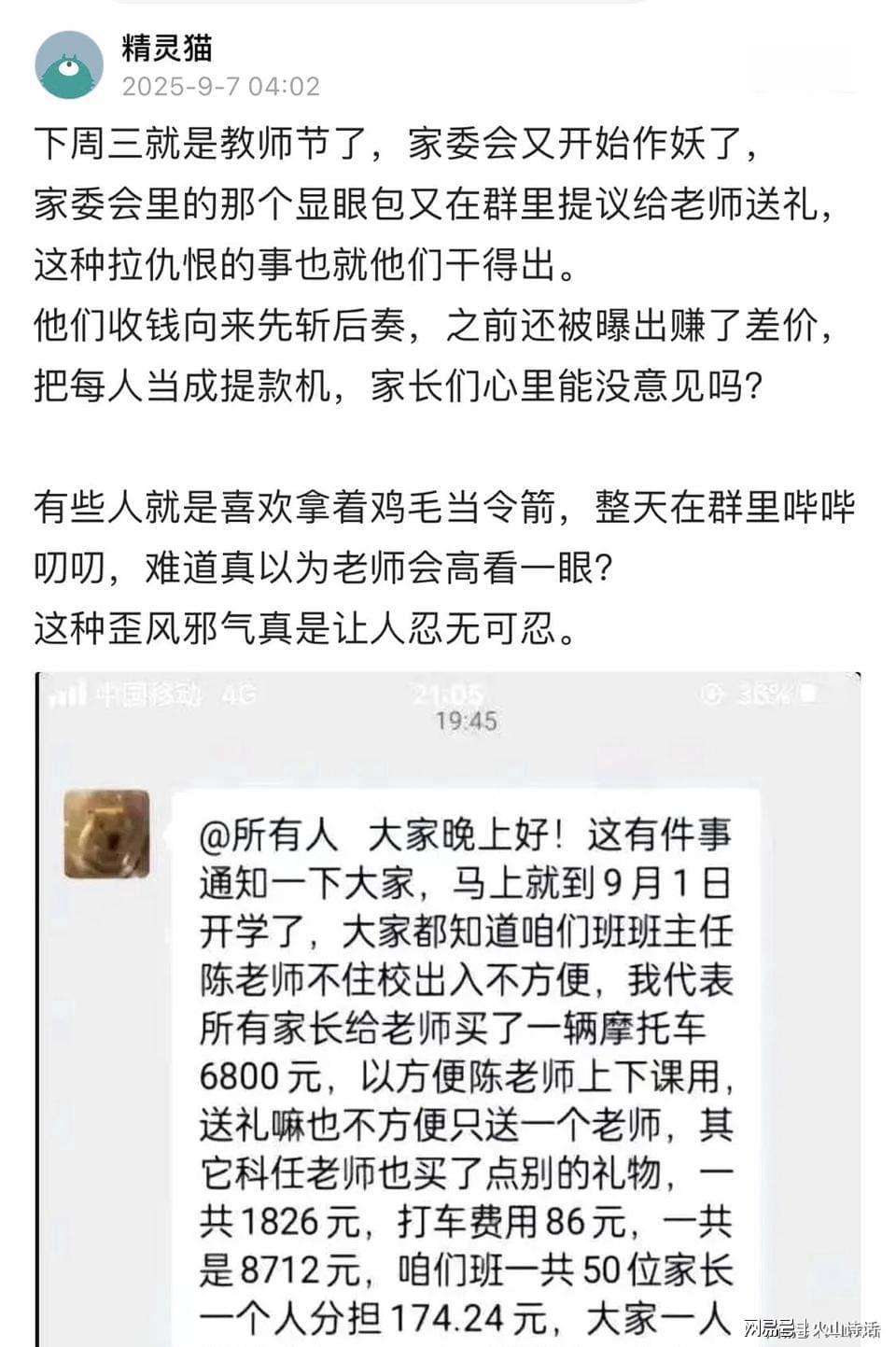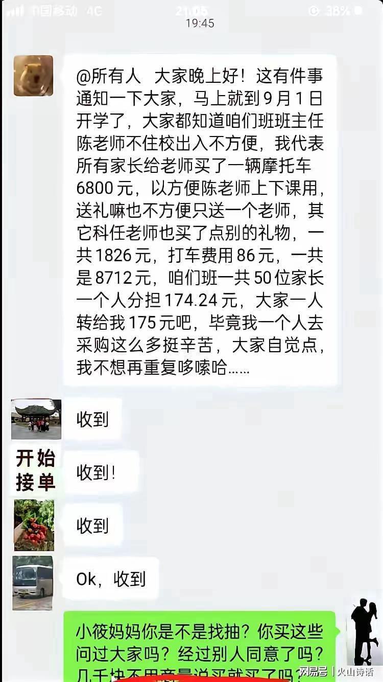 上述对话内容来看,让人颇为震惊。一个家委会家长,居然不经过任何沟通,为老师买了一辆6800元的摩托车。这种做法,事后有家长回应收到,但很快有家长怒斥这种行为。