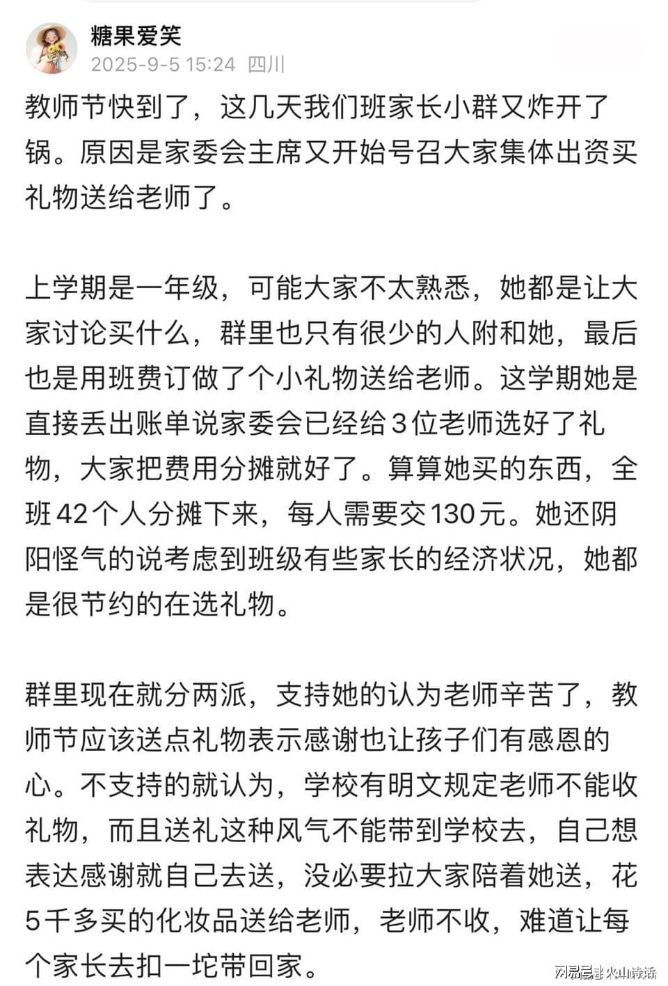 - 说到教师节送礼,还有更夸张的。前几天就有网友发帖感慨,下周三就是教师节了,家委会又开始作妖了,家委会里的那个显眼包又在群里提议给老师送礼,这种拉仇恨的事也就他们干得出。
