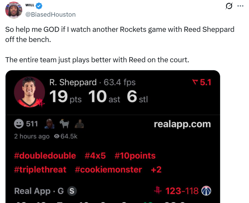 另外一名火箭媒体人RooshWilliams也给出相同看法:“谢泼德送出了10次助攻,很好地组织了进攻,乌度卡必须继续将其留在首发阵容中直到赛季结束。”