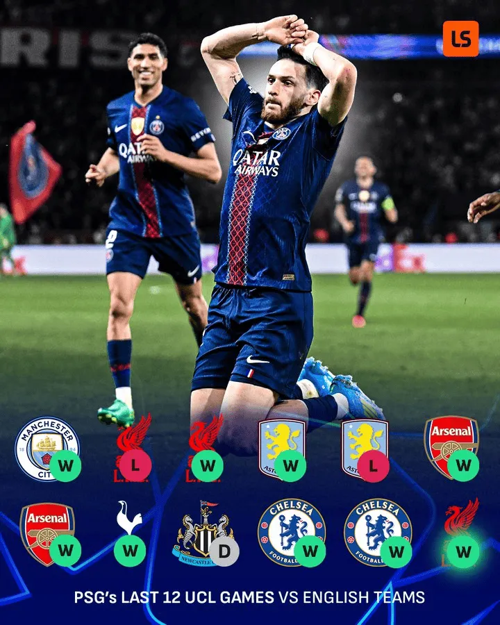 根据LiveScore的统计,巴黎圣日耳曼最近12次对阵英超球队,取得了9胜1平2负的傲人战绩。